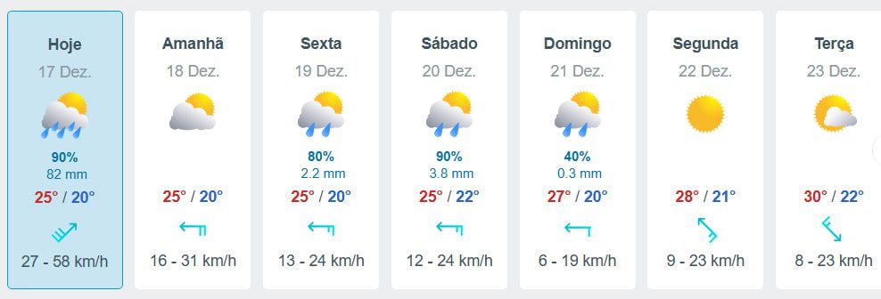 • Domingo (21/12): O tempo começa a abrir gradualmente. A chance de chuva cai para 40%, com volume irrisório de 0.3 mm e temperaturas subindo para 27°C.